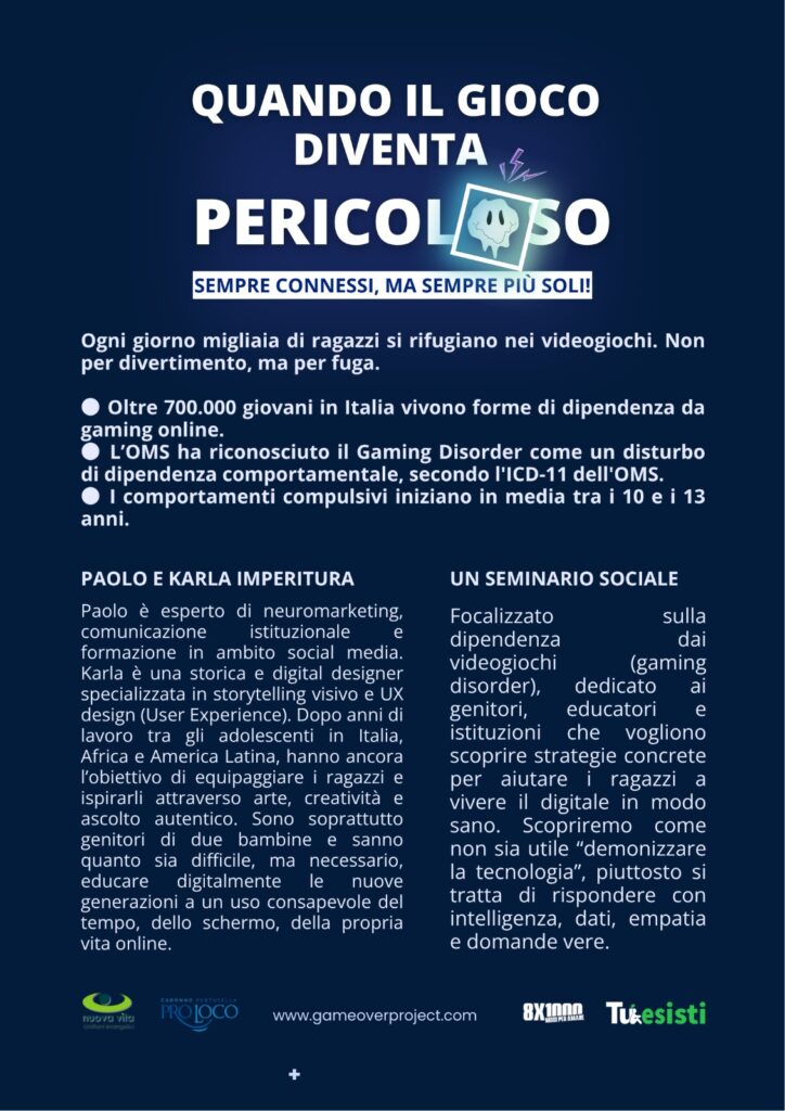 Vogliamo ricordare a tutti l’evento di domani sera, Venerdi 7 Novembre, il seminario sul Gaming Disorder, riconosciuto dall’OMS come disturbo di dipendenza comportamentale che colpisce i più giovani.